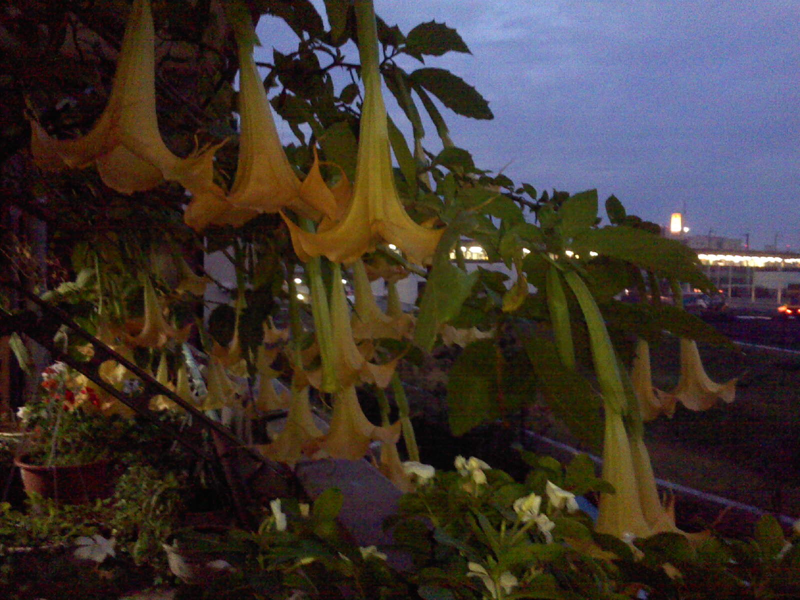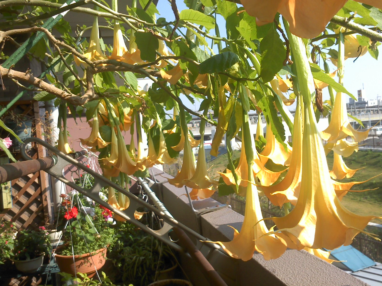 今から10年ほど前に、100円で買った10センチくらいのエンジェルトランペットの苗は、数年で天井に届くほど伸び、毎年、12月の初め頃に天辺を切らなければならない。春と初秋と晩秋の3回、大輪の黄色い花を枝もたわわに咲かせる。夜も昼も咲いているのに、不思議なことに夕暮れから未明にかけてだけ妖艶な香りを漂わせる。他の花は外から見えなくても、これだけは徒歩5分ほどの最寄の駅ホームからはっきり見ることができる。台風が来る度に、折れてしまわないかと気にかかる。