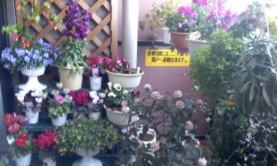 写っているのは、ジンチョウゲ、ゼラニウム、プリムラマラコイデス、ガザニア(1輪だけ咲いている)、ランタナ(まだ冬眠中)、ペチュニア(越冬した花が一ヶ月ほど前まで咲いていた)、アイビー(観葉植物)、ハツユキカズラ(観葉植物)、パンジー、ジュリアン、ストック、ヴィオラ、ガーデンシクラメン、ラナンキュラス、アブチロン(通称「チロリアンランプ」)。 写ってはいないが、これから咲き始めるものは、バラ、サンパラソル、ムクゲ、チョウセンアサガオ(通称「エンジェルトランペット」)、クチナシ、アマリリス、サルスベリ、など。 |